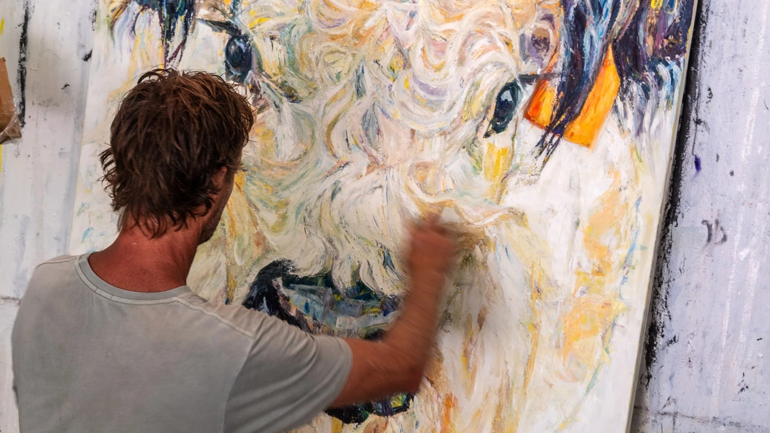 Tucked away peacefully in the suburbs of Byron Bay is oil painter Vlad Kolas’ home studio. He darts around rocking bare feet and paint-splattered shorts as Bowie belts out from his phone.