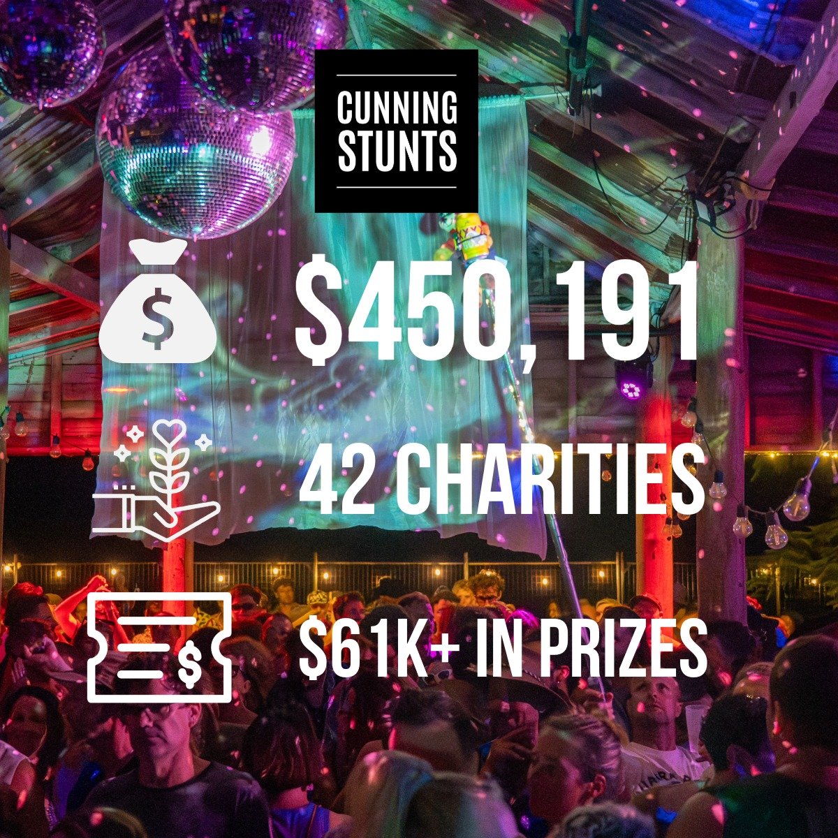Cunning Stunts has donated more than $450,191 to 42 local charities since 2015. Awarded Byron Shire’s Community Event of the Year (2020), Nudge Nudge Wink Wink is the monthly party where world-class DJs play in the best-sounding shed in the Southern Hemisphere, all while raising funds for local causes.
